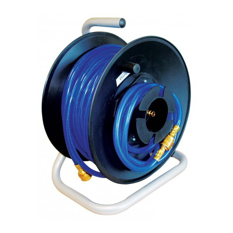 Prenosný navíjací bubon z tvrdeného plastu na rúrkovom podstavci. 20 m tlaková PVC hadica s textilnou vložkou, rýchlospojkou a axiálne vyvedenou vsuvkou (priamo z bubna) / 0,5 m spojovacia hadica s koncovkami pre pripojenie ku kompresoru.